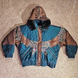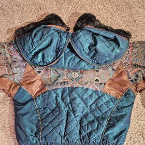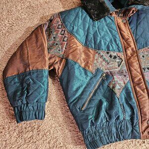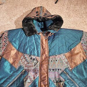Vintage East West Jacket Womens Medium Quilted Hood Faux Fur Trim Southwestern