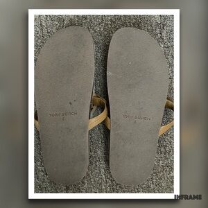 Stylish Tory Burch sandals. Features brown leather straps. Comfortable and chic design.