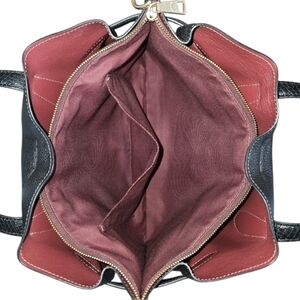 • Dark red leather interior, has multifunction pocket, magnetic snap closure, and a center zip compartment