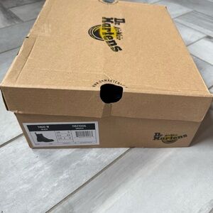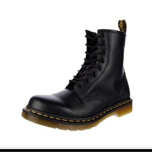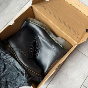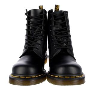 Experience the iconic style of Dr. Martens with these New In The Box black combat boots, featuring smooth leather and distinctive yellow stitching. The high-top design offers ankle support, while the thick, translucent sole ensures durability and comfort. Perfect for making a bold statement, these boots are a timeless addition to any wardrobe.