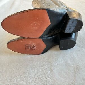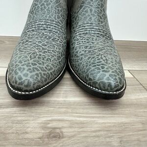 Stylish gray cowboy boots with intricate stitching. Perfect for a Western look.