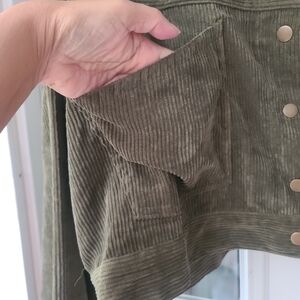 Stylish olive corduroy jacket. Cropped design. Button-up front. Perfect for layering.