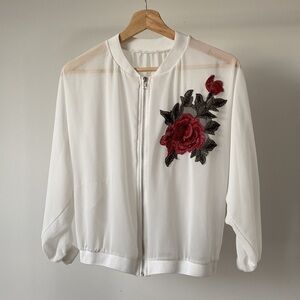 A lightweight statement layer. This sheer white bomber jacket features a bold red rose floral applique on the chest. Perfect as a breezy festival cover-up or layering piece over a bralette.