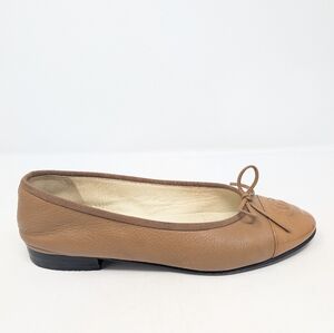 Chanel Tan Brown CC Leather Cap Toe Ballet Flats Ballerinas Size 38