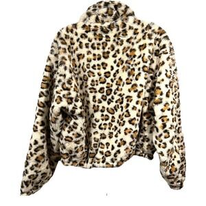 Victoria's Secret Know One Cares Faux Fur Cropped Jacket Animal Print Size Large Full Zip Drawstring Waist Satin Lining Bomber Jacket Style