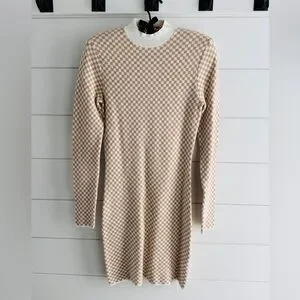 Very cute & cozy long sleeve sweater dress with a cream and tan checkered pattern. In very good pre-owned condition, no flaws. See pictures to verify condition and measurements.