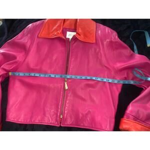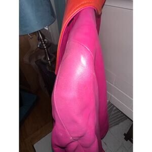OUTSTANDING VINTAGE EIGHTIES GLOVE LEATHER JACKET FROM VAKKO IN HOT PINK WITH ORANGE COLLAR AND CUFFS. PINK LINING. SIZE SMALL, MEASUREMENTS IN PHOTOS. EXCELLENT CONDITION (very top of shoulders are just slightly faded hard to see even in person and doesn't show in photos)