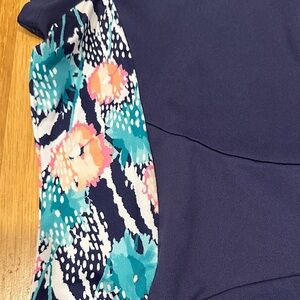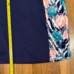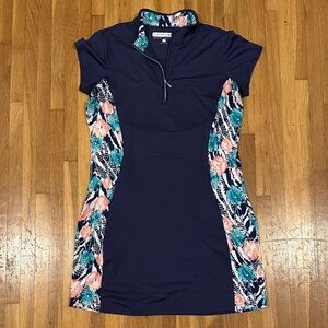 Pebble Beach | Women’s. Navy dress with vibrant multicolor accents. Features performance fabric - great on the golf course, at the club, or for dinner. 2 zipper pockets on each side. No additional lining or shorts or padded chest area. Multicolor accent colors on both sides are fading color. Zipper front with mock neck that has colorful print.