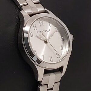 This ladies' Caravelle by Bulova watch features a silver-toned dial with numeric markers and luminous hands in a 24.0mm stainless steel case. The reliable Japanese quartz movement ensures accurate time keeping. The alternating polished and brushed stainless steel link bracelet secures with a jewelry clasp. This watch is new in the box and works perfectly.