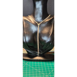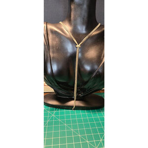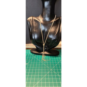 This pre-owned, unbranded women's lariat necklace features multiple strands of gold-tone beaded chain. It has a sliding, rounded gold-tone bead that allows adjustment of the drop length. The necklace fastens with a lobster clasp, which shows some tarnishing, as do other metal components. The overall length of the necklace, when laid flat, is approximately 16 inches from clasp to the end of the longest drop.