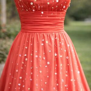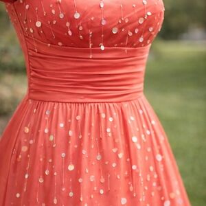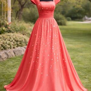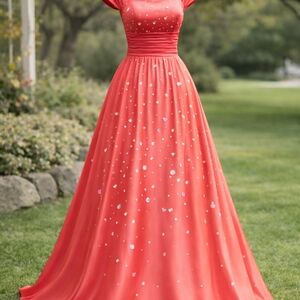 Beautiful coral-red prom dress with a soft, romantic silhouette and eye-catching sparkle details. This gown features a fitted bodice with delicate shimmer accents that cascade gradually below the waist, creating subtle movement and shine as the skirt flows.
