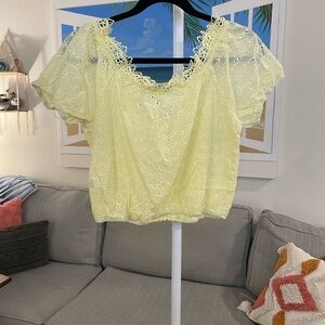 Chic yellow crop top with lace trim. Features a v-neck and short sleeves. Ideal for a stylish look.