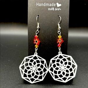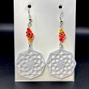 White with Orange Mandala Earrings with Beads