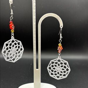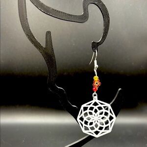 These stunning earrings showcase a large, circular pendant with an intricate mandala design, enhanced by vibrant orange beads. The delicate web-like pattern and striking color combination make them a captivating accessory for any occasion.