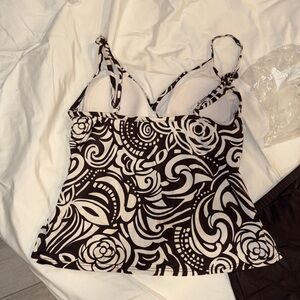 Elegant black and white swirl pattern tankini. Features a stylish design for beach outings.