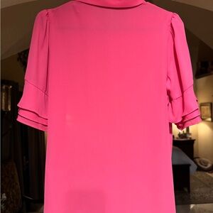 A vibrant pink blouse from Tommy Hilfiger featuring a button-up front and short ruffled sleeves. Perfect for adding a pop of color to any outfit.