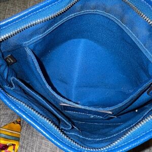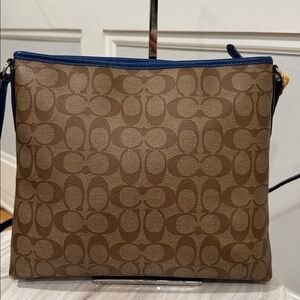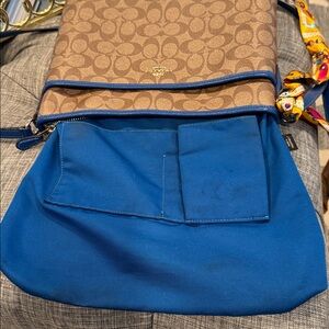 Stylish Coach women's bag in brown and blue. Perfect for any occasion with its elegant design and vibrant colors. This bag is in good used condition. Please see all pictures for use. This bag includes an unbranded Twilly. Measurements are approximate.