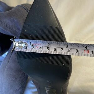 Elevate your style with these sophisticated gray over the knee boots from Le Chateau. Crafted from a suede-like material, they feature a sleek pointed toe and a chic stiletto heel for a touch of elegance. The snug fit along the calf ensures a flattering silhouette, perfect for any fashionable outing. Comes in original box.