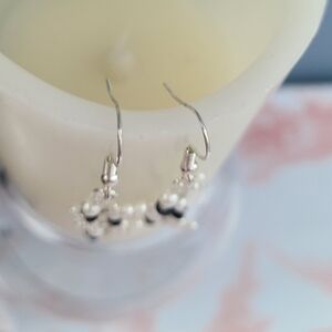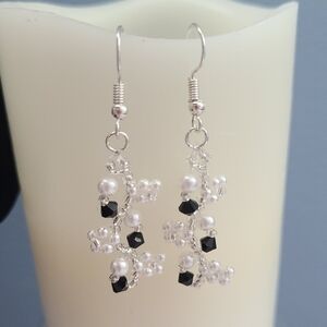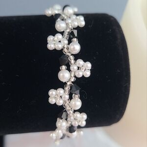 These handmade, dainty, intricate dangle earrings and matching bracelet feature silver-toned metal with black crystals, faux pearls, and silver seed beads woven with flowers make of tiny faux pearls.