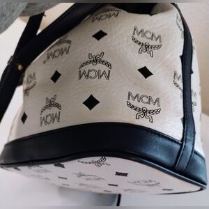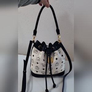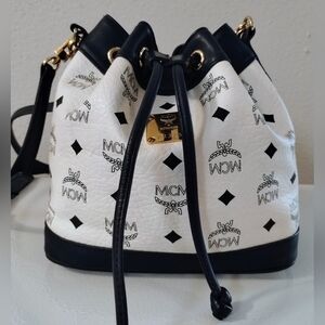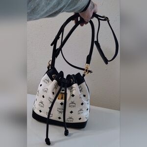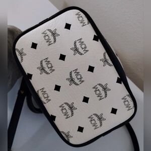 Elegant MCM crossbody bag. Features a striking black and white pattern. Gold accents enhance its luxury. Ideal for versatile styling. Limited edition bag that has handles in addition to the crossbody strap. Gorgeous mint condition bag!