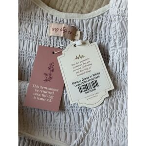 The NWT Ivy City Co. Marlow Midi Dress in women's size Large features a white cotton fabric with smocked bodice. The sleeveless design, scoop neckline, and fit & flare style give it a Bohemian-inspired look that is ideal for summer and spring seasons.