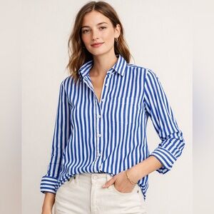 Classic J.Crew long sleeve button-down shirt in blue and white vertical stripes with subtle swiss dot texture. 100% cotton, lightweight and breathable. Features a structured collar, chest pocket, and button cuffs. Perfect for workwear, coastal preppy style, or casual layering.