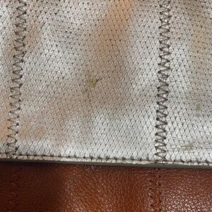 Elegant crossbody with silver leather top and tan leather base. Chain strap adds a modern touch. Ideal for day or night. Offers welcomed!