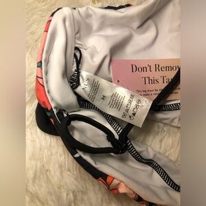 Vibrant floral bikini top with black straps. Features colorful flowers on a dark background.