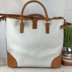 This is a Dooney and Burke Shelby shopper tote bag in white with tan leather trim and a matching detachable wristlet bag. Pre-loved condition. Note: rub stain on the back from tan handle. Sold As Is! Please look the last picture.