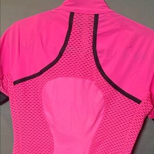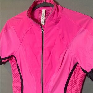 Lululemon Pace Line short sleeve cycling jersey in bright pink. Designed for cycling and high-performance workouts with a full zip front and fitted athletic silhouette.