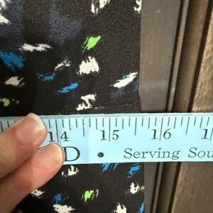 J. Crew NWT black sheath dress showcasing a vibrant abstract print in white blue and green. This sleeveless V-neck dress features a flattering faux wrap bodice and a concealed back zipper for a seamless look. The dress is fully lined for comfort and a polished finish. Perfect for a business casual office day or brunch.