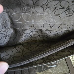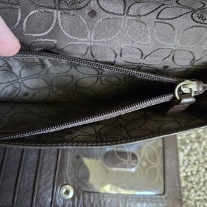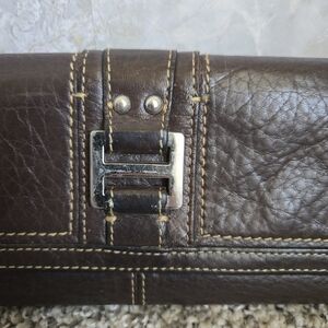 Elegant Fossil wallet. Rich dark brown leather. Stylish buckle detail. Perfect for everyday use.
