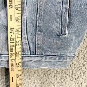 Item: Vintage denim trucker style jacket with button front closure and brown leather collar.