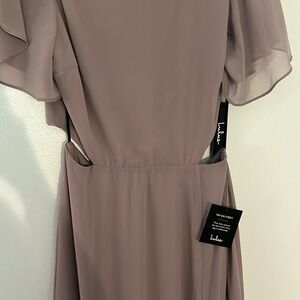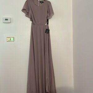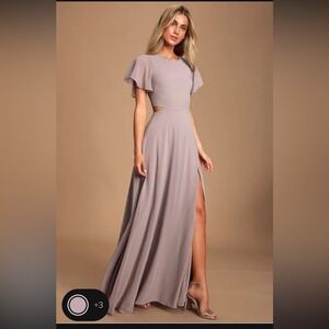 Keywords: Lulus dress, maxi dress, dusty lavender gown, bridesmaid dress, wedding guest dress, cutout dress, flutter sleeve, formal gown, evening dress prom, high slit dress, romantic style, chiffon maxi
