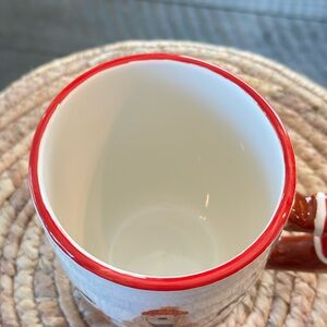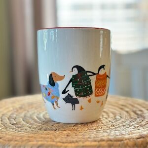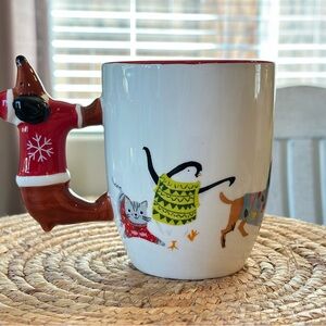 Charming winter-themed mug featuring a dachshund dog handle and sweater wearing dogs, cats, and penguins. Perfect for warm cozy drinks all winter.