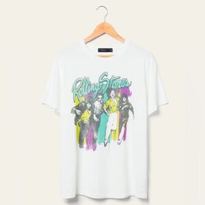 White t-shirt featuring a colorful Rolling Stones graphic. Perfect for music fans.