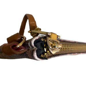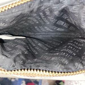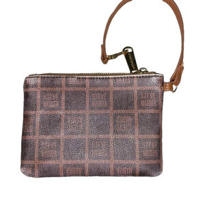 This is a brown and tan checkered Steve Madden wristlet. It is made of coated poly and has a brown leather wrist strap. The wristlet is 7.5 inches wide, 4.5 inches tall, and 1 inch deep. It has a main zippered compartment and the interior of the wallet is lined with black fabric. The wristlet is in good condition, with some color wear on the corners.