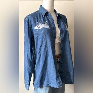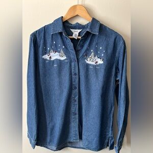 Vintage 90s Northern Reflections 100% Cotton Christmas Holiday Denim Button Up