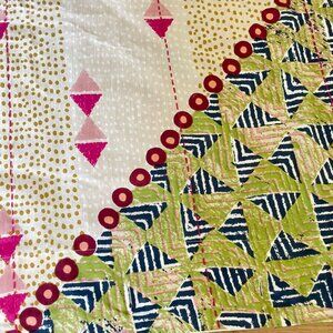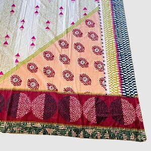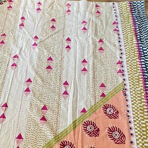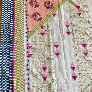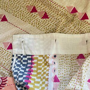 By Anthropologie Printed Jem Cotton Shower Curtain. Designed to add a boho aesthetic to your bathroom.. Globally inspired print in vibrant shades of red, orange, green, and blue. Twelve buttonholes for hanging.