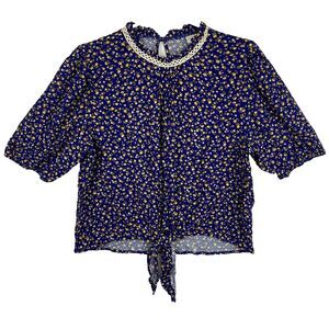 Blue Floral Print Half Sleeve Top Rayon Blouse Women Size L