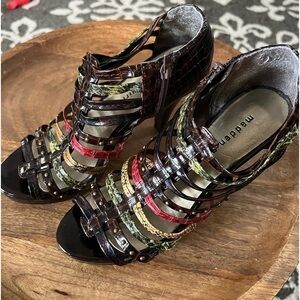 Madden Girl Gladiator Style High Heel Shoes. Size 8. Brown multi color.