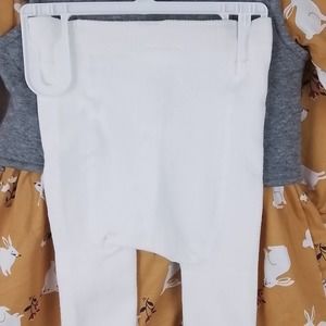 This set comes with a dress, vest, and tights. The vest is a sleeveless design with quilted fabric and a single button closure. The dress is a cotton/viscose blend. It is lightweight and breathable. The dress features a scoop neck, long sleeves, and flared skirt. The back of the dress is a snap up. The white tights are soft, cozy, and have a generous stretch. This set is perfect for easter. New with tags.
