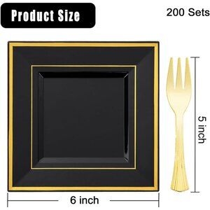 200PCS Black and Gold Plastic Dessert Plates with Plastic Forks -6’’ 100 Square
