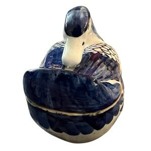 Beautiful vintage blue-and-white porcelain swan trinket box with a sculptural figural design. This covered dish features hand-painted cobalt blue detailing with feather and scale motifs, giving it a classic chinoiserie / Delft-inspired look.
