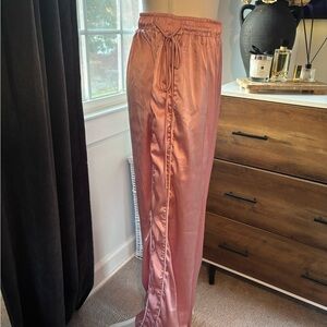 Chic blush satin track pants. Relaxed fit with a stylish sheen. Ideal for casual elegance.
