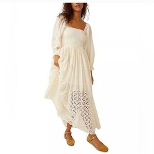 Free People Cream Long Sleeve Maxi Boho Crochet Flowy Dress Medium