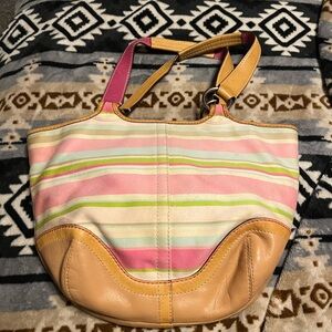 Stylish Coach shoulder bag with multi color stripes. Features a buckle detail and canvas and leather details.