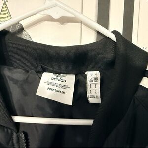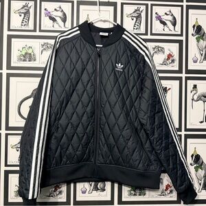 Classic Adidas quilted bomber jacket with zipper pockets and striped sleeves. Lightweight yet warm, add a stylish layer to any outfit.