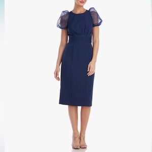 New with tags! The JS Collections Harley Cocktail Dress in navy is a sophisticated statement-maker. Designed with dramatic puff sleeves and a flattering fitted silhouette, this knee-length dress is perfect for weddings, cocktail parties, and holiday events.