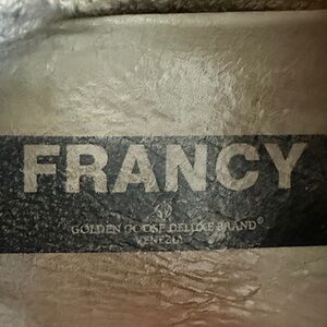 Re: the size. Immediately to the right of the “Francy” label on the insole, you should see a tonal (therefore hard to see) imprint of the EU size (above that will be imprinted “Genuine Leather. Made in Italy”. Alternatively, if you remove the insole, you should see the same 2-digit size number printed in black ink on the actual sole of the sneaker. In this location, it is usually accompanied by another 3 or 5 digit model and/or color identifier. Hope that helps.